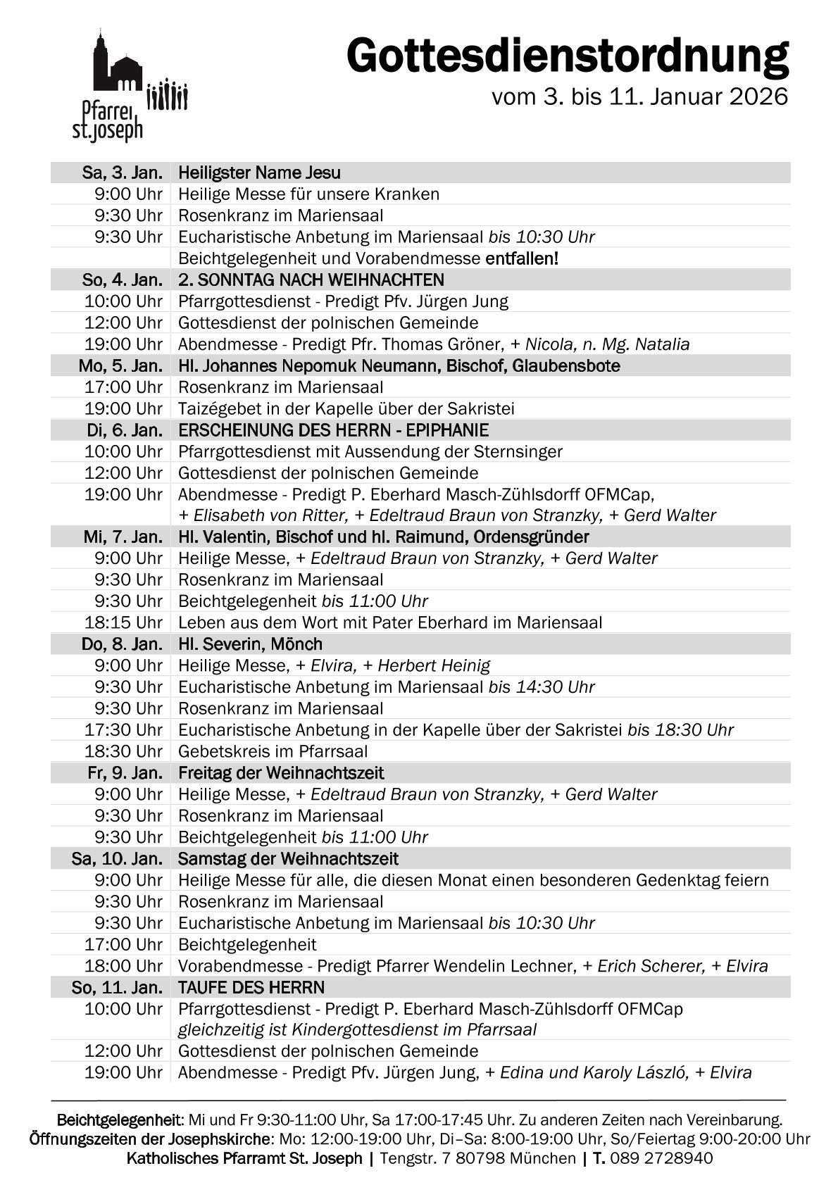 So steht es ganz oben auf der Fassade unserer Josephskirche. Mit diesen Worten begrüße ich auch Sie herzlich. Die Pfarrei St. Joseph kommt ganz aus der Tradition des franziskanischen Ordens der Kapuziner, die über 100 Jahre hier ein Kloster unterhielten. Heute wollen wir als Pfarrei mitten in der Stadt weiter eine Gemeinschaft sein, die das Wort Gottes hören und leben möchte. Wir freuen uns, wenn auch Sie bei uns eine geistliche und freundschaftliche Heimat finden. Willkommen in St. Joseph!