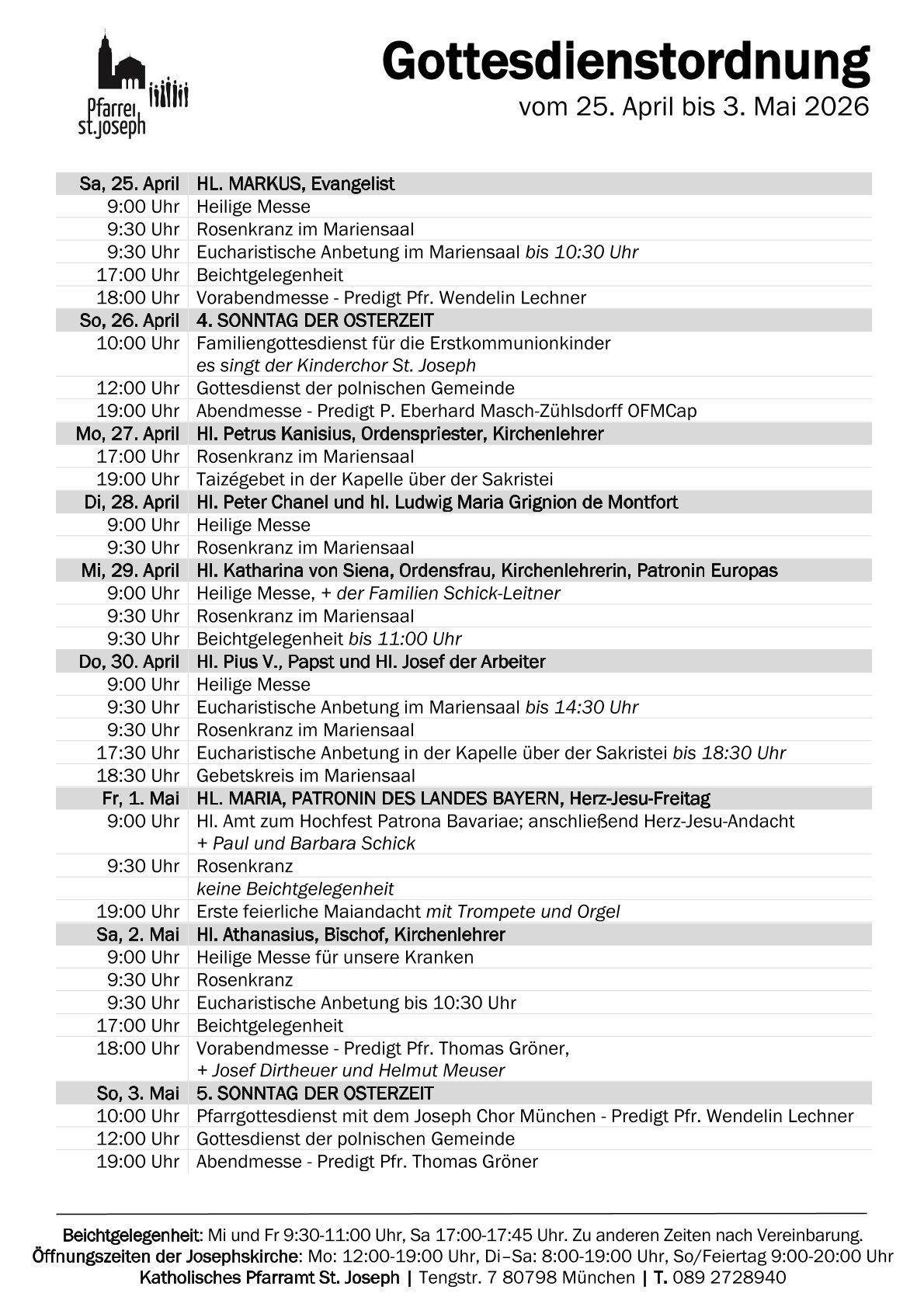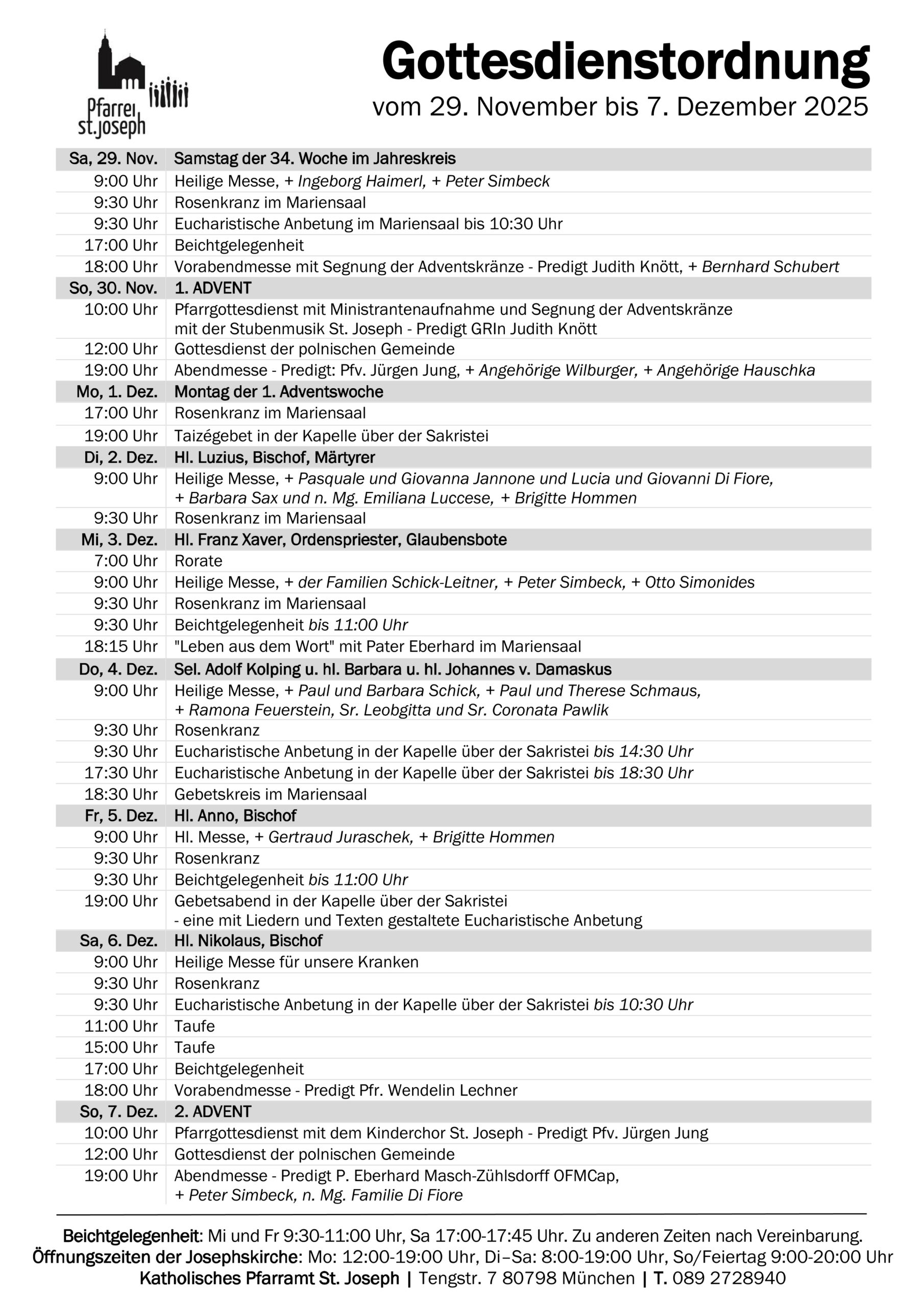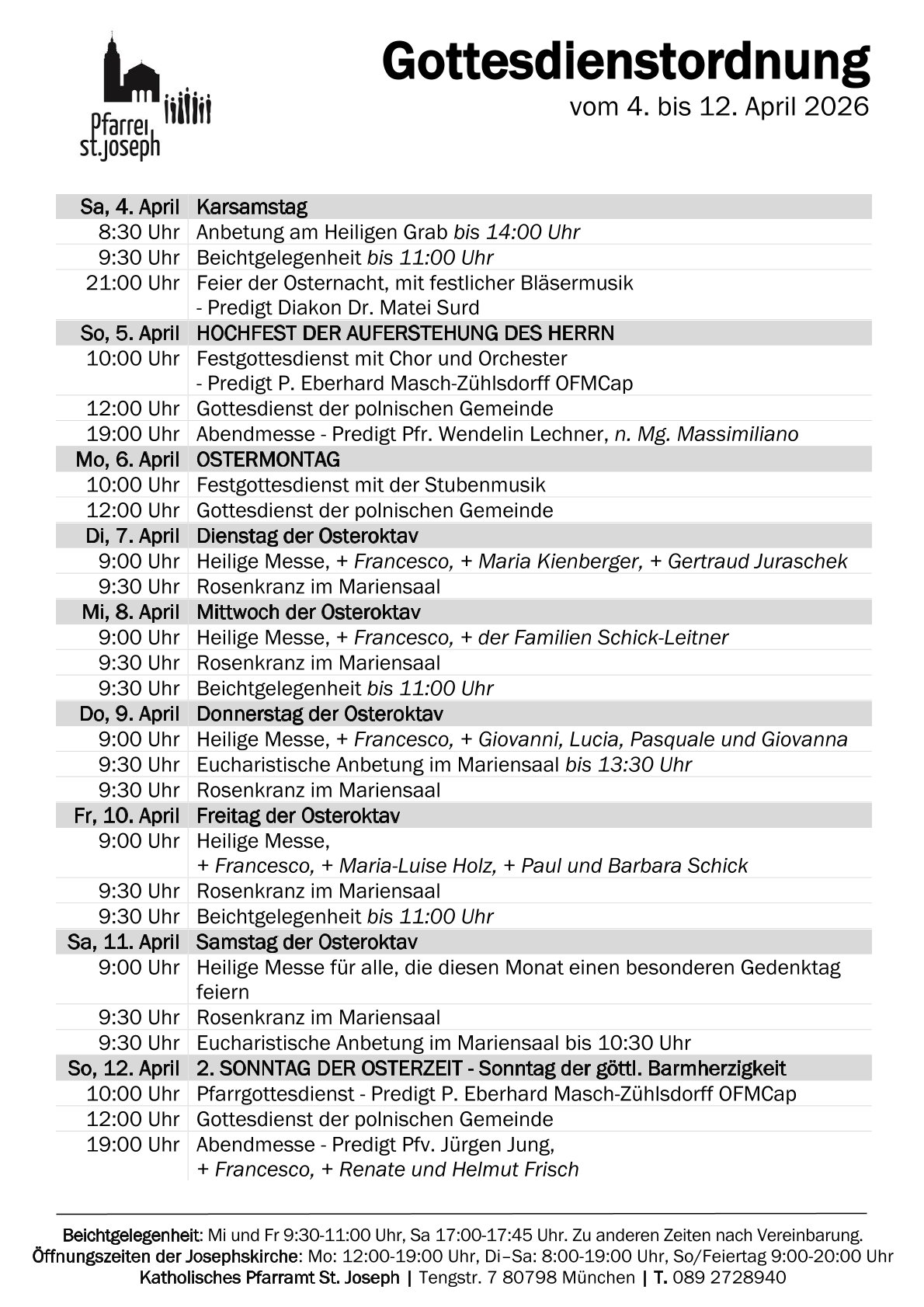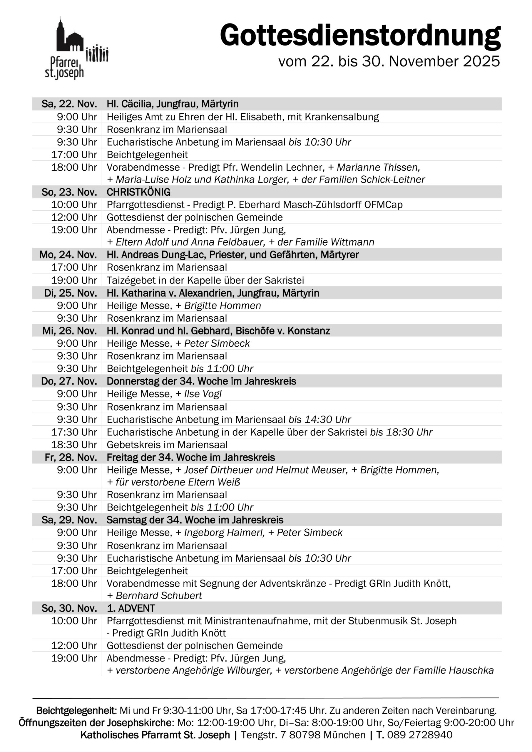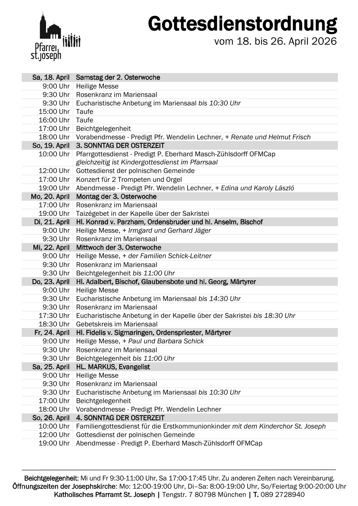 So steht es ganz oben auf der Fassade unserer Josephskirche. Mit diesen Worten begrüße ich auch Sie herzlich. Die Pfarrei St. Joseph kommt ganz aus der Tradition des franziskanischen Ordens der Kapuziner, die über 100 Jahre hier ein Kloster unterhielten. Heute wollen wir als Pfarrei mitten in der Stadt weiter eine Gemeinschaft sein, die das Wort Gottes hören und leben möchte. Wir freuen uns, wenn auch Sie bei uns eine geistliche und freundschaftliche Heimat finden. Willkommen in St. Joseph!