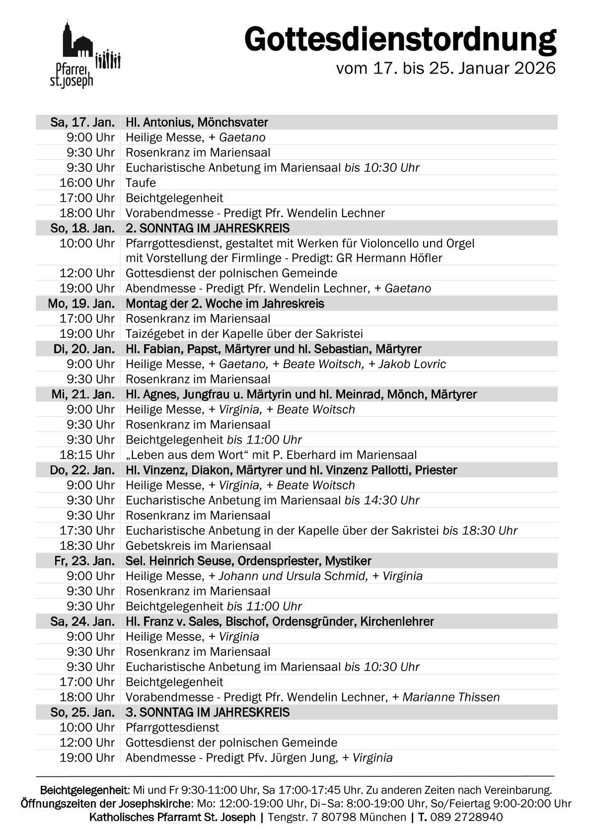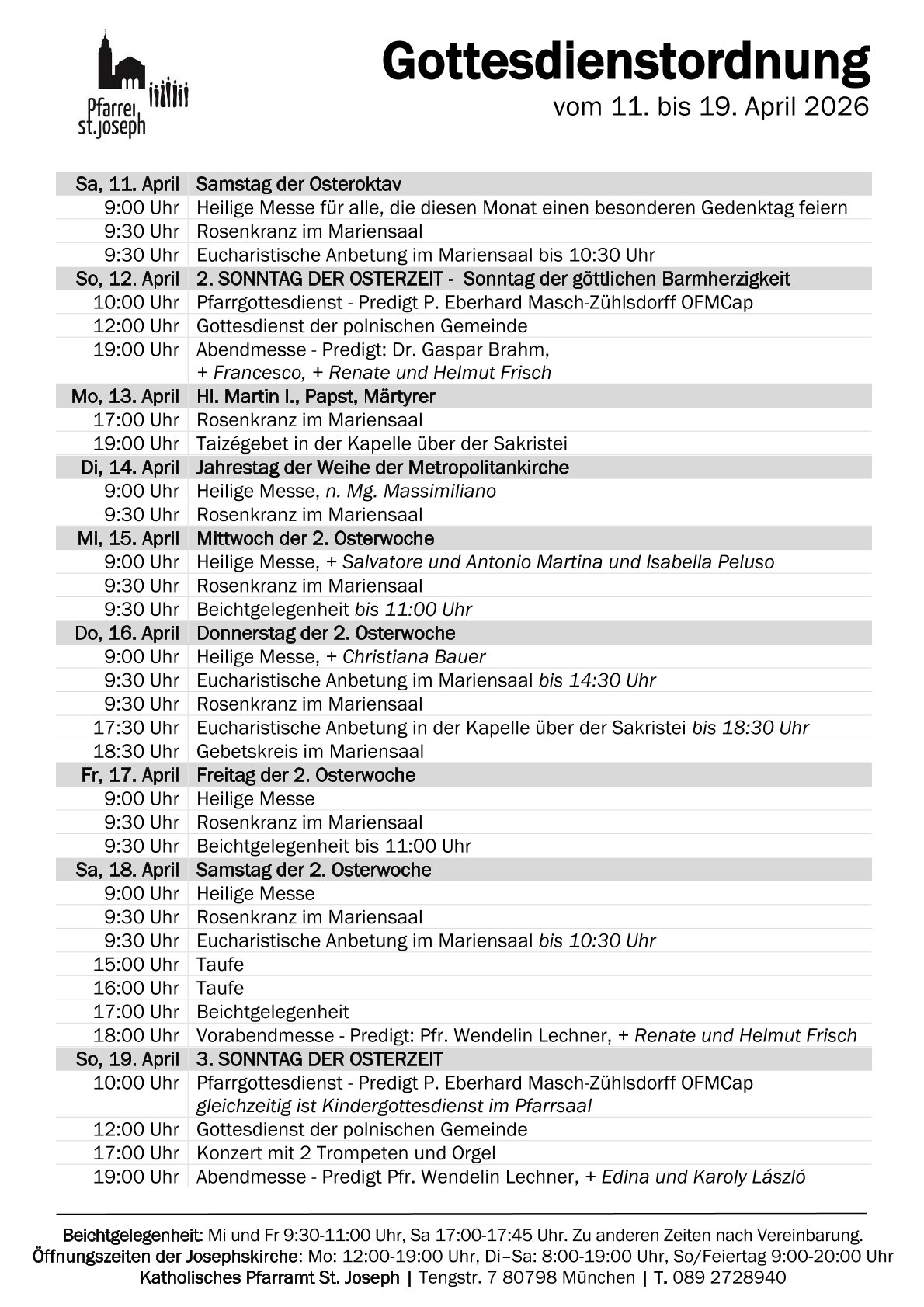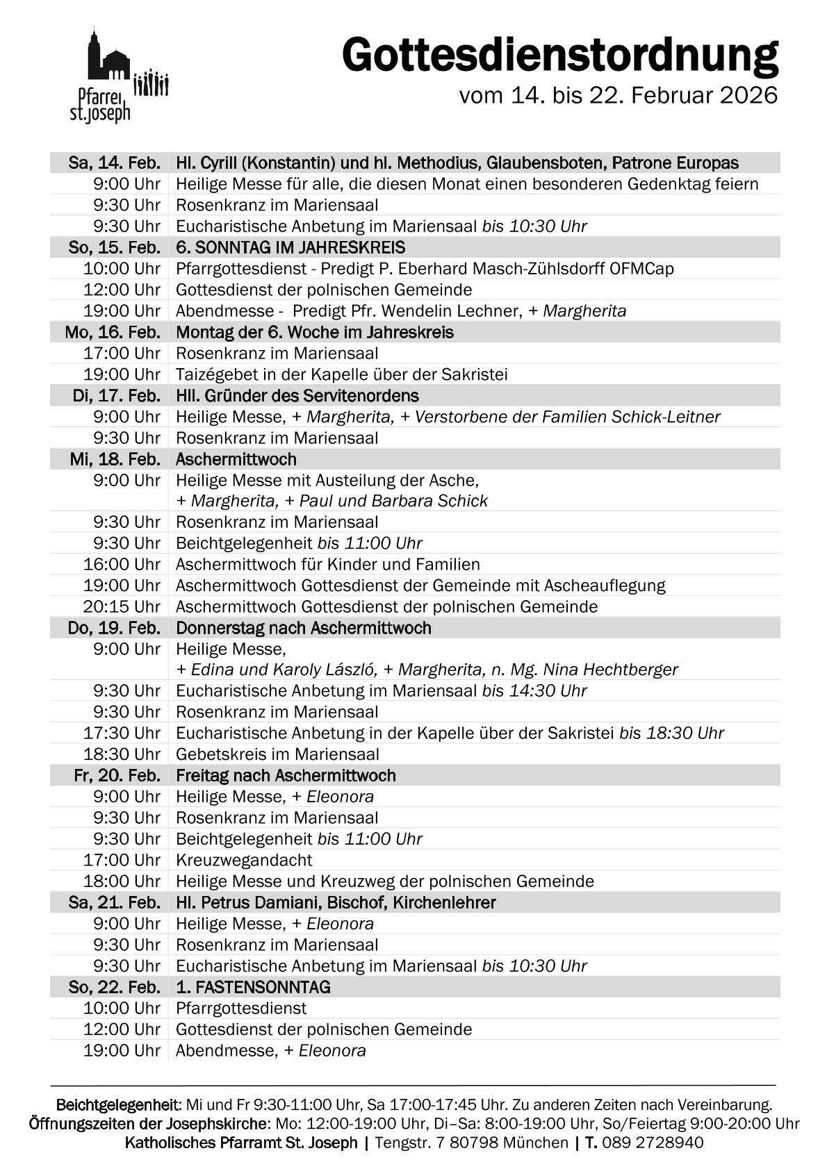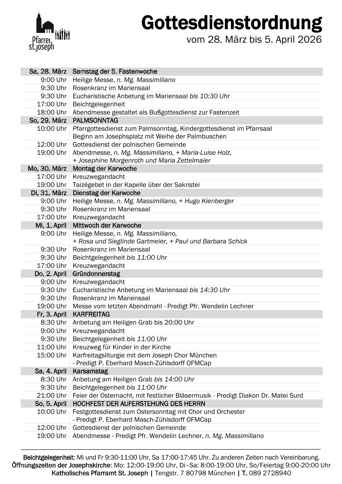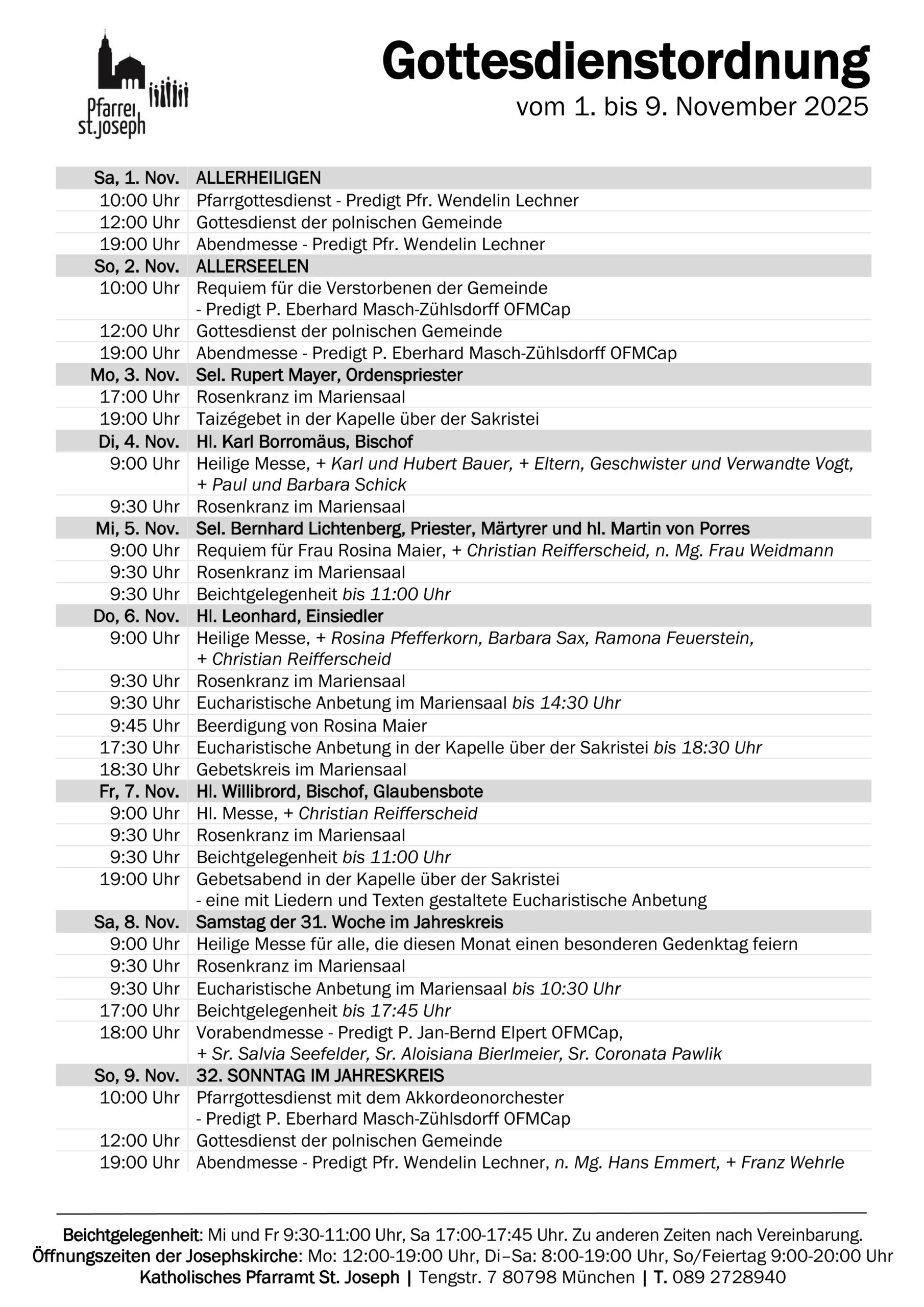 So steht es ganz oben auf der Fassade unserer Josephskirche. Mit diesen Worten begrüße ich auch Sie herzlich. Die Pfarrei St. Joseph kommt ganz aus der Tradition des franziskanischen Ordens der Kapuziner, die über 100 Jahre hier ein Kloster unterhielten. Heute wollen wir als Pfarrei mitten in der Stadt weiter eine Gemeinschaft sein, die das Wort Gottes hören und leben möchte. Wir freuen uns, wenn auch Sie bei uns eine geistliche und freundschaftliche Heimat finden. Willkommen in St. Joseph!