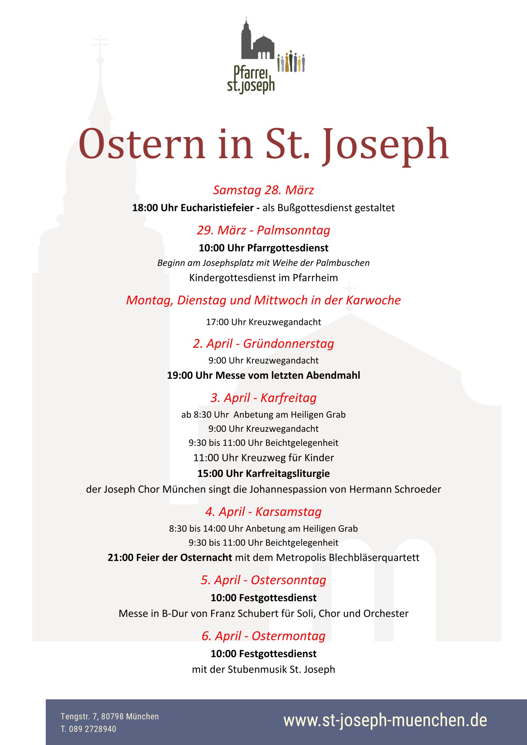 Ostern 2026 in St. Joseph Email schreibenAnrufen Entdecken Sie weitere Angebote bei uns in St. Joseph Pfarrbrief März Nächstes Seniorencafé Mi 18. März 14:30 Nächster Kindergottesdienst So 29. März 10:00
